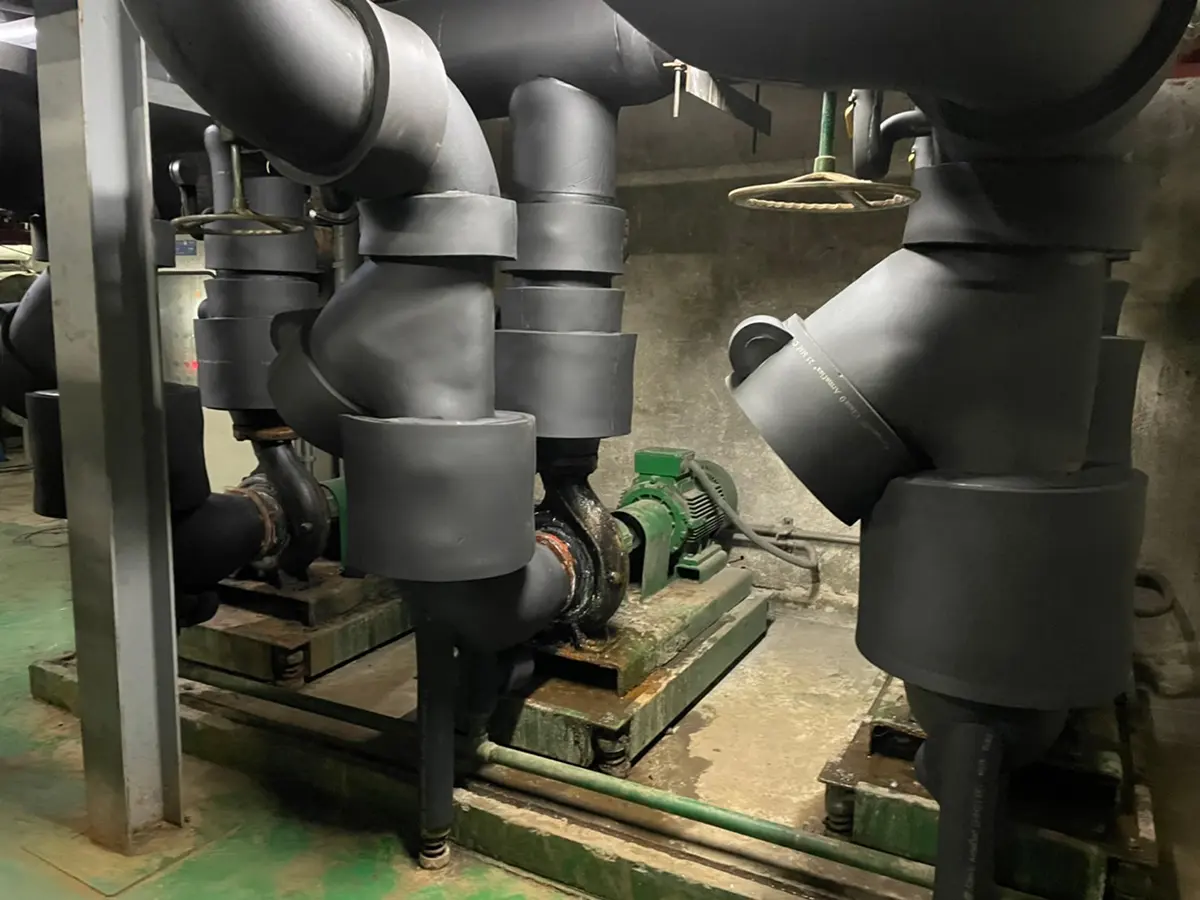 針對老舊設備及管線保溫材老化問題,本案進行全面汰舊換新作業,將原有破損、失效的保溫層拆除後,改用 Armacell Armaflex O級及PE非鹵素保溫材,提升防火與隔熱性能,並加強防潮層處理,延長設備使用壽命,整體施工效率高,讓客戶在最短時間內恢復系統最佳狀態。